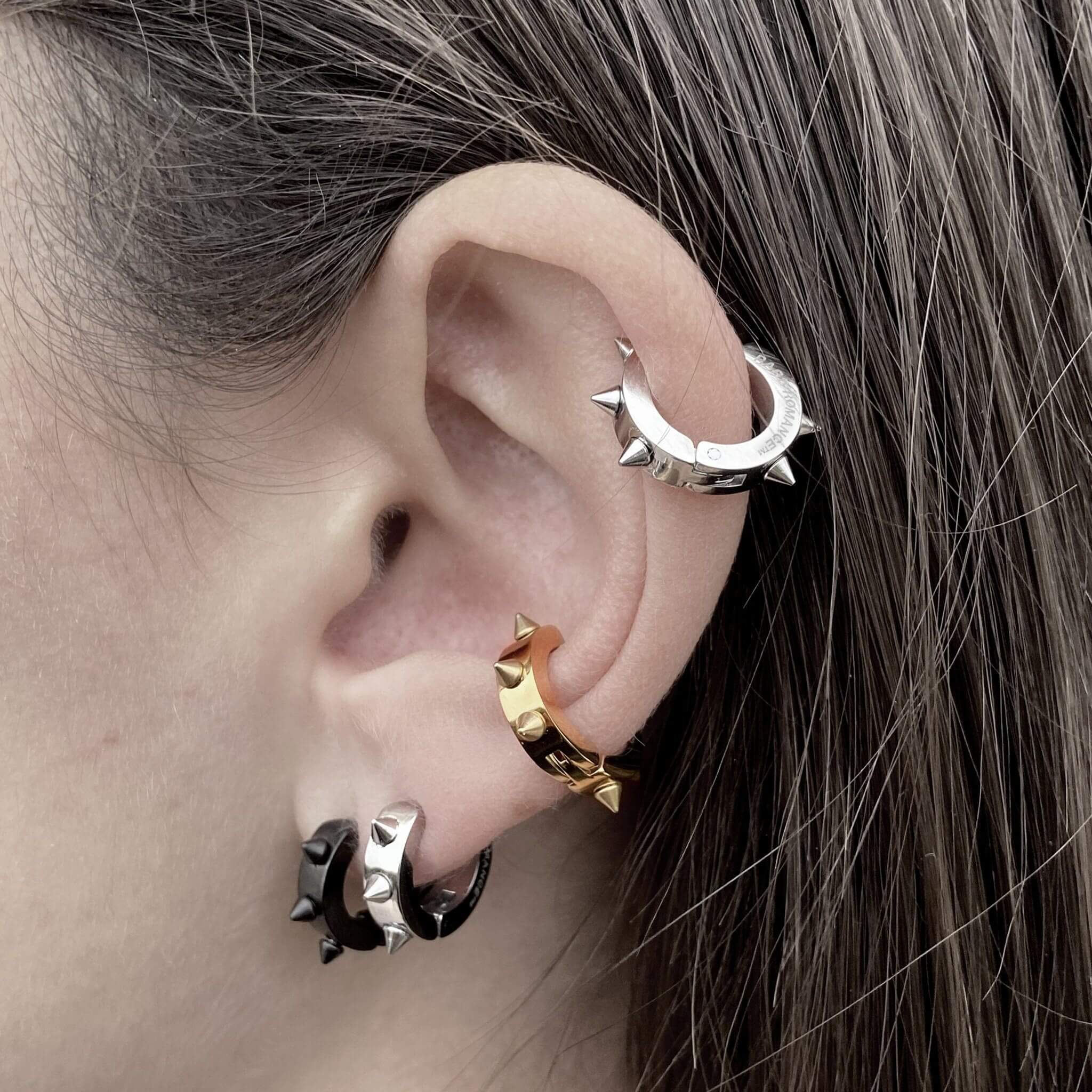Hechos de acero inoxidable hipoalergénico disponible en acabados dorado, negro mate y plateado, estos aretes con clip tienen una banda con tachuelas y el detalle del logotipo RARE-ROMANCE™. Diseñado para abrazar perfectamente tu oreja y permanecer en su lugar sin perforarla. Se envía en ROMANCE RARO ™, perfecto para regalar.