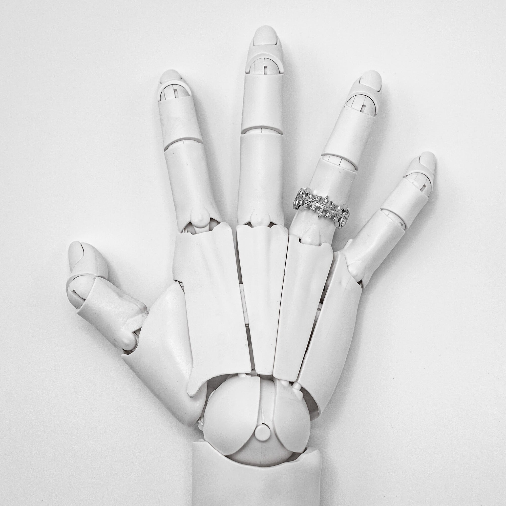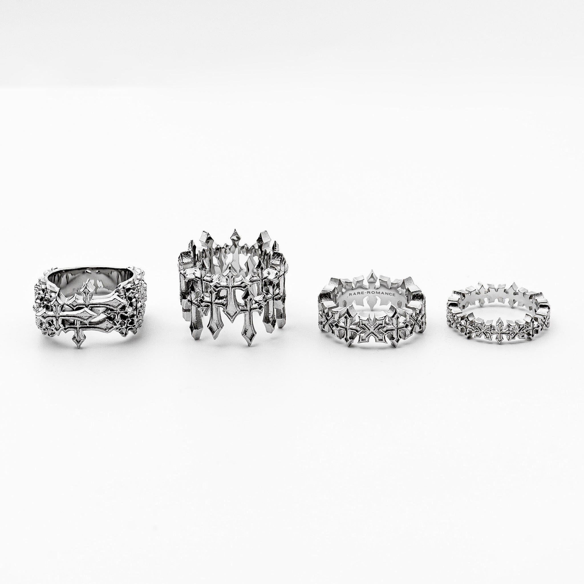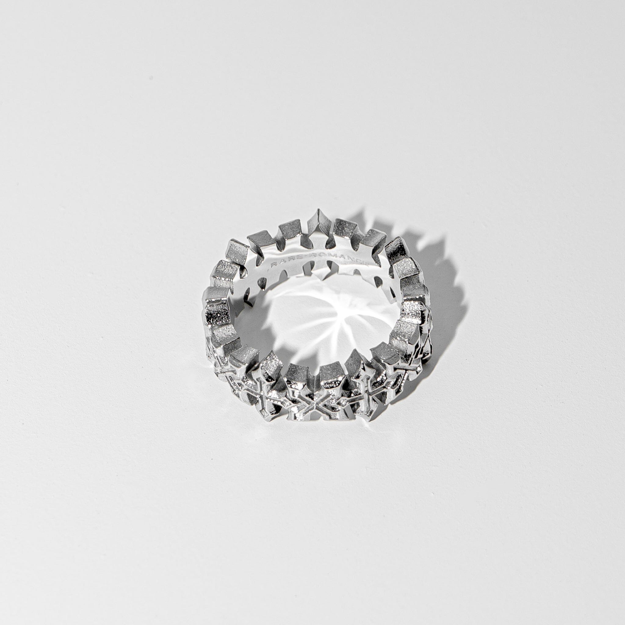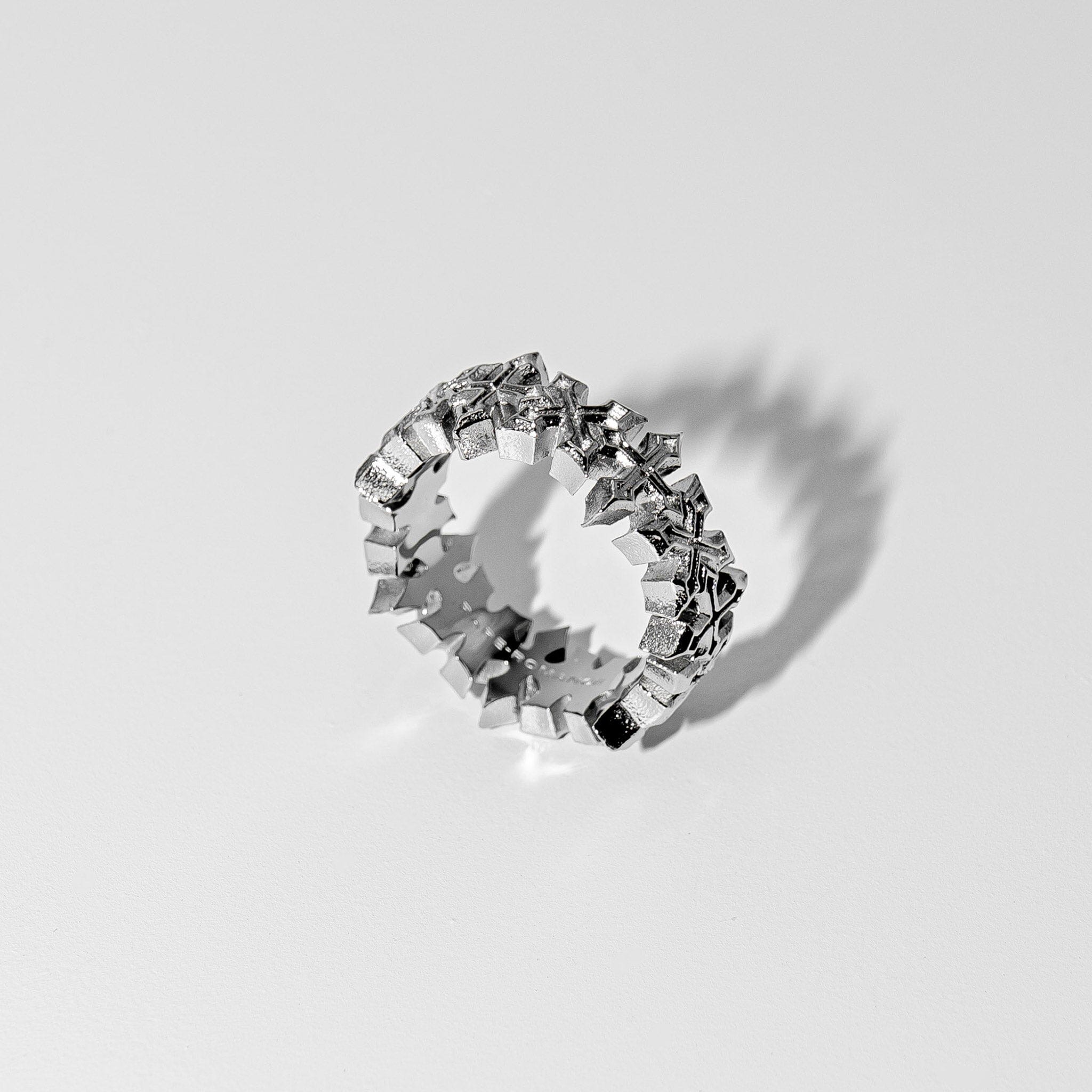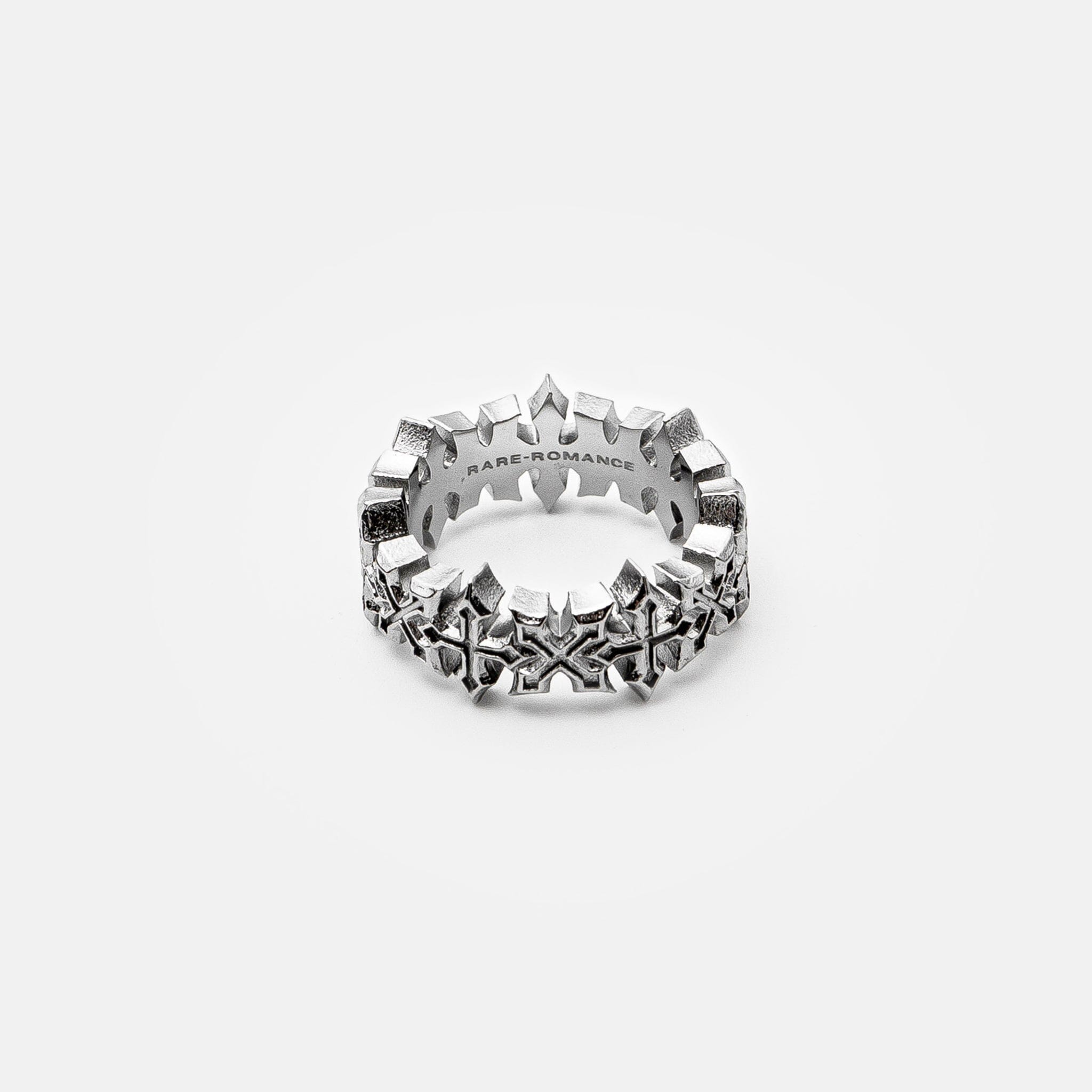 A wide band of interlocking crosses, wrapping fully around the finger in a continuous, uninterrupted design. No beginning, no end. Just a solid repeat all the way through.