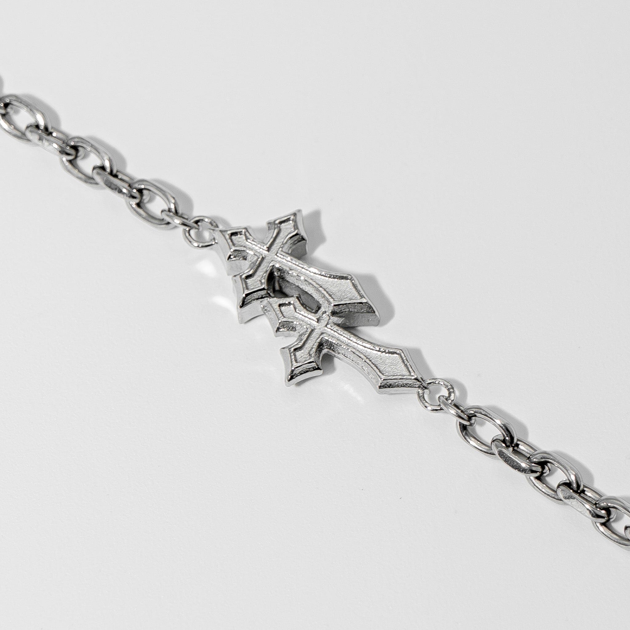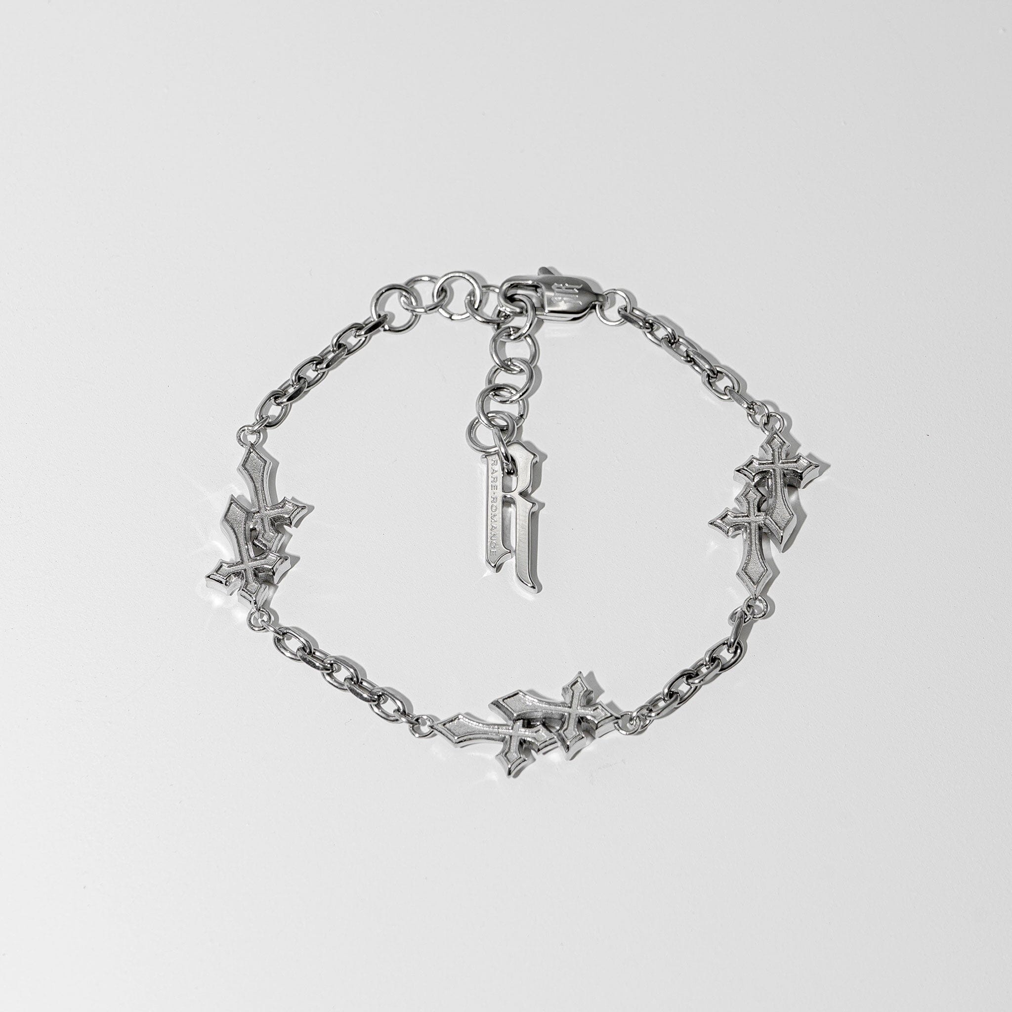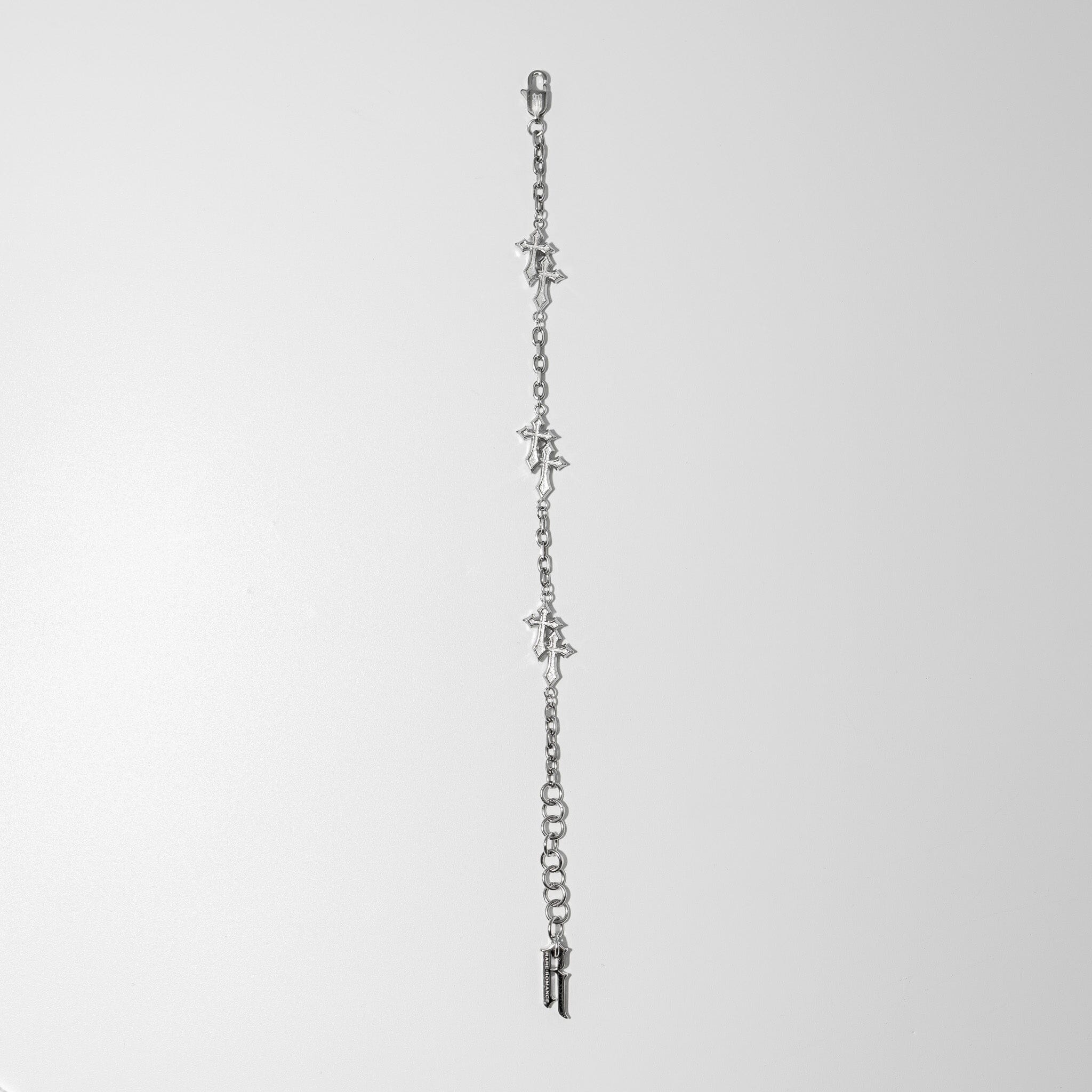 An anchor chain bracelet featuring three sets of RARE-ROMANCE signature crosses, spaced evenly throughout for a balanced, minimal look.