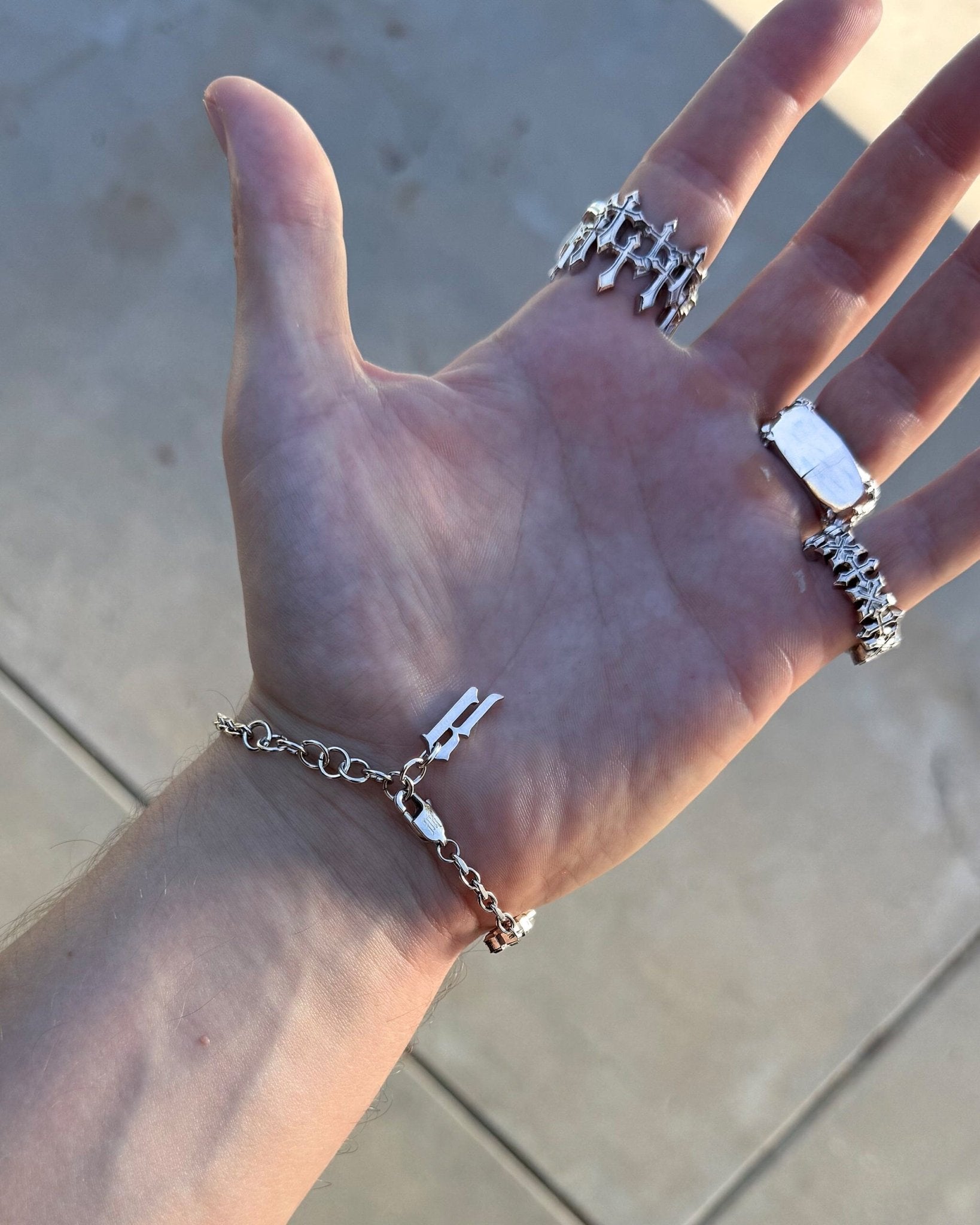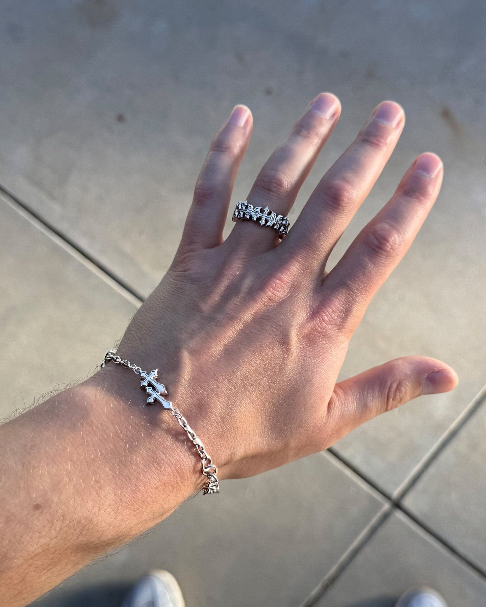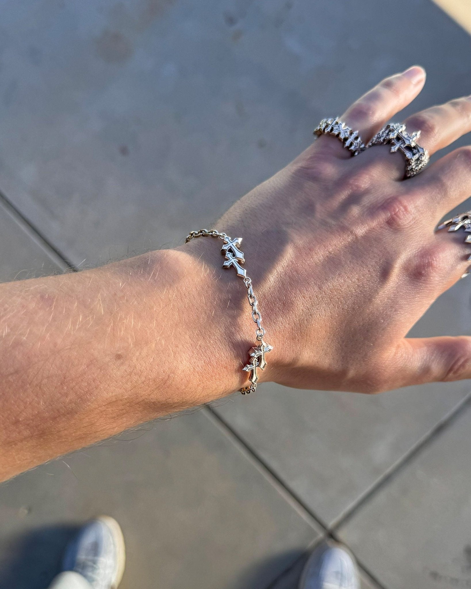 An anchor chain bracelet featuring three sets of RARE-ROMANCE signature crosses, spaced evenly throughout for a balanced, minimal look.