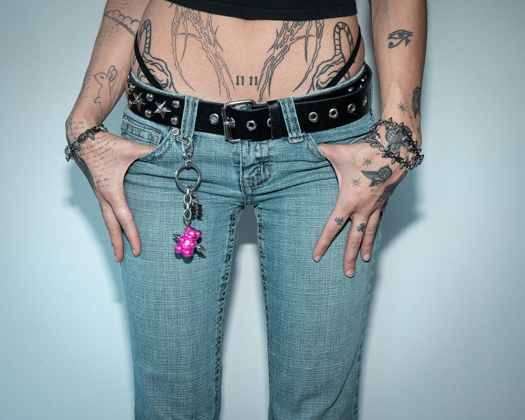 Your sweet tooth’s worst nightmare. A metal gummy bear on a chunky chain with the RARE-ROMANCE tag. Built like jewelry, made to take a beating. Available in silver and pink. Stainless steel construction that won’t fade, rust, or lose its shine.