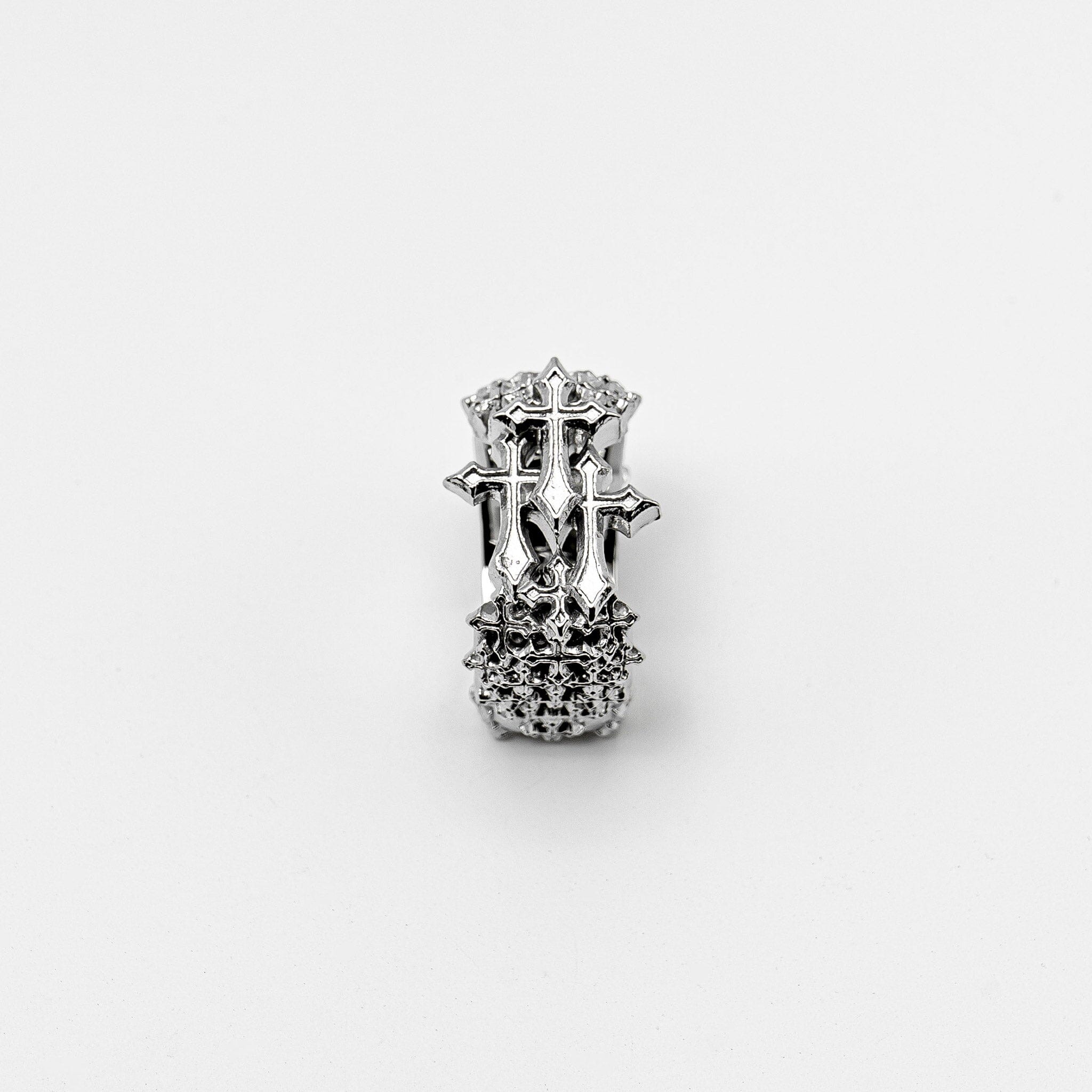 A dense surface of interlocked crosses, built up with three larger crosses sitting on top. Like markers rising from a graveyard, they stand above a base of tightly packed crosses