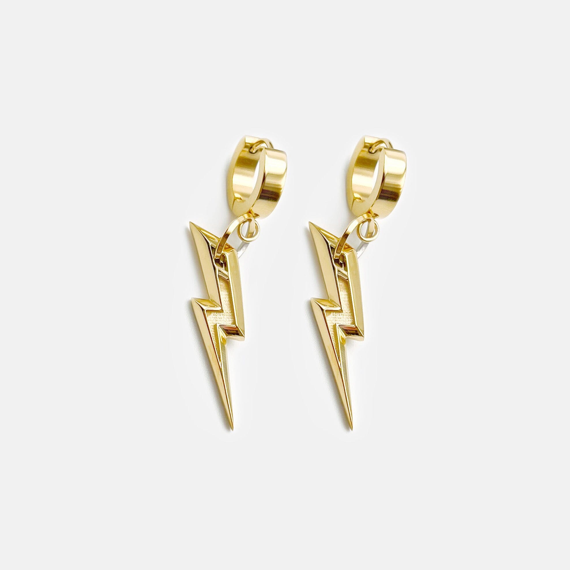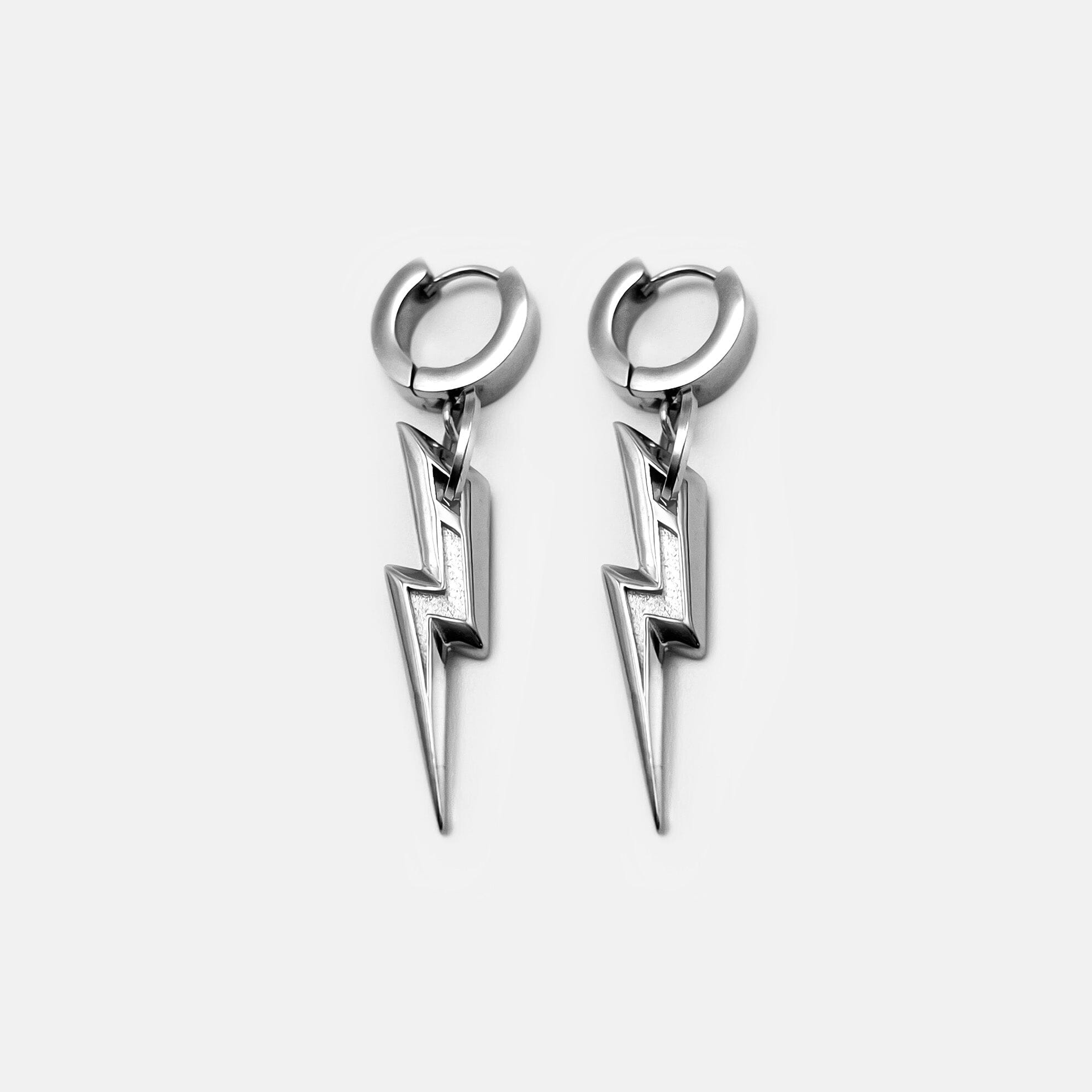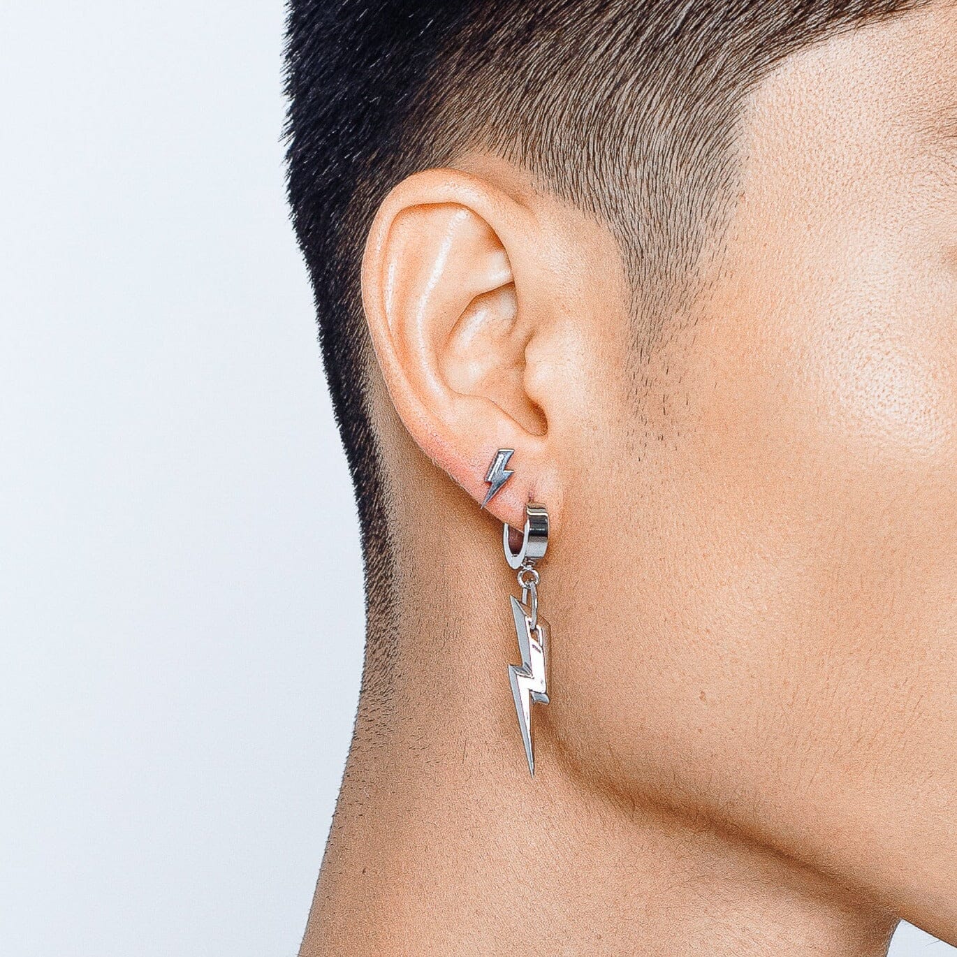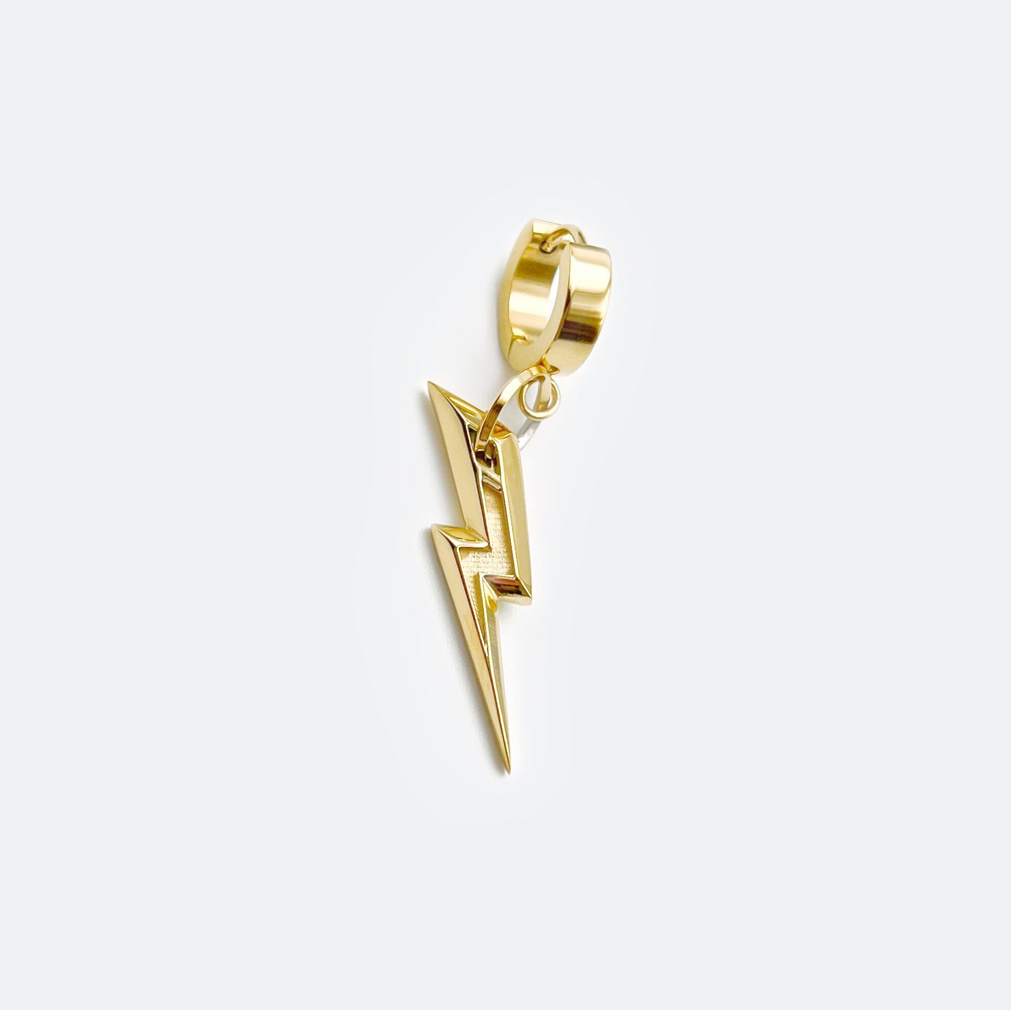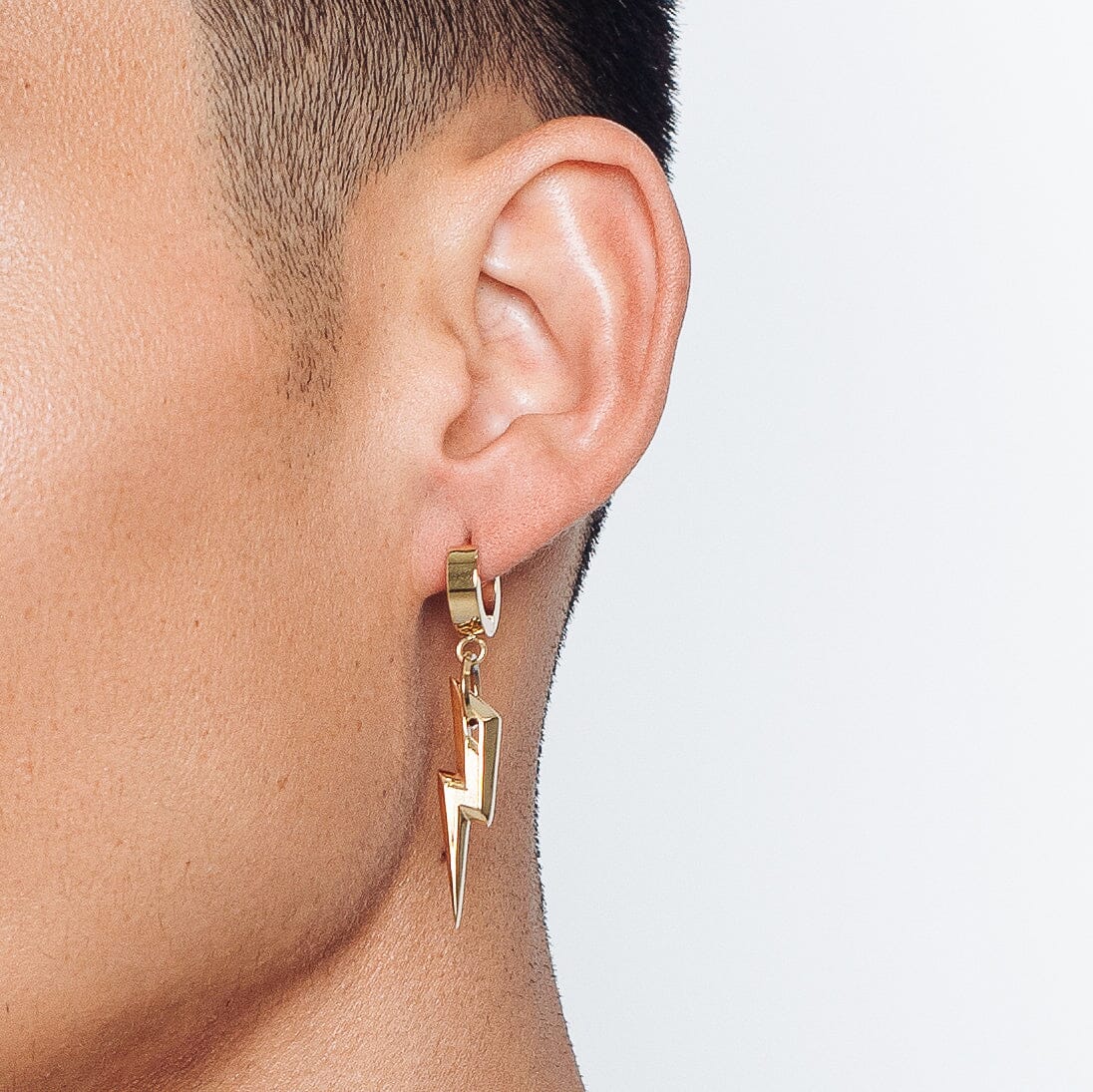 Una obra de arte electrizante. Este estimulante arete de aro está adornado con un rayo extruido con bordes lujosamente suaves y un centro texturizado para una composición bellamente equilibrada. Está grabado nuestro clásico emblema R.