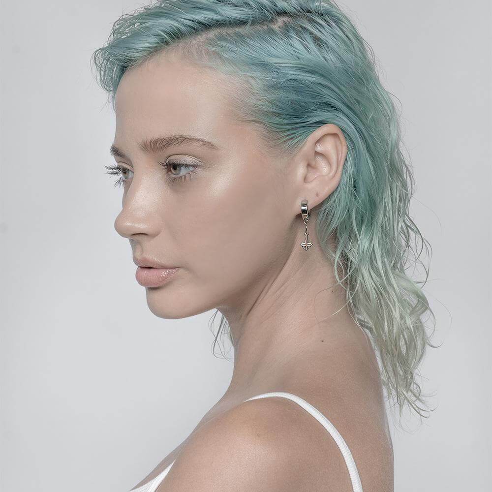 These earrings have a dangle cross and band featuring the RARE-ROMANCE™ logo detail. The cross has a hollowed out center so you can flip it upside-down. Made of hypoallergenic stainless steel and available in gold, black and silver finishes. A hinged snap closure makes them easy to wear in pierced ears. Ships in RARE-ROMANCE™ branded packaging, perfect for gifts.