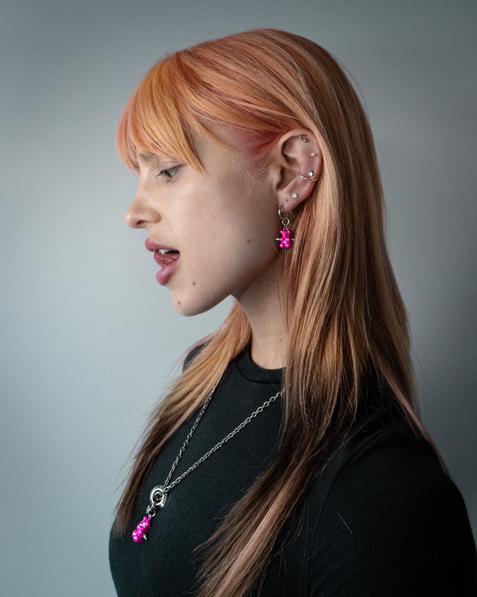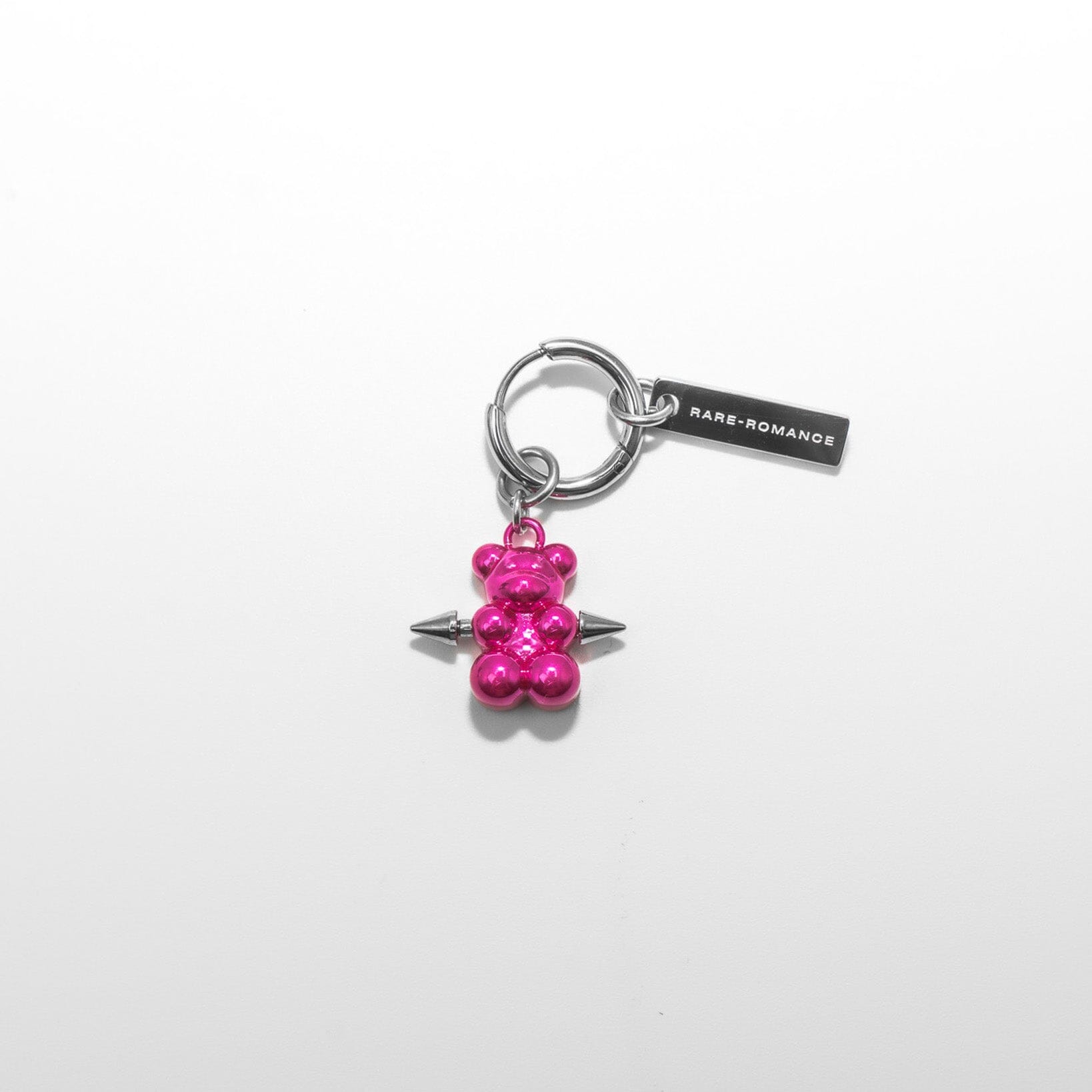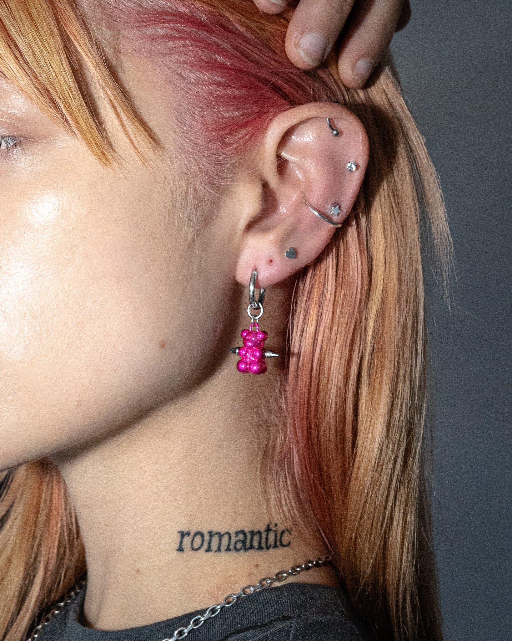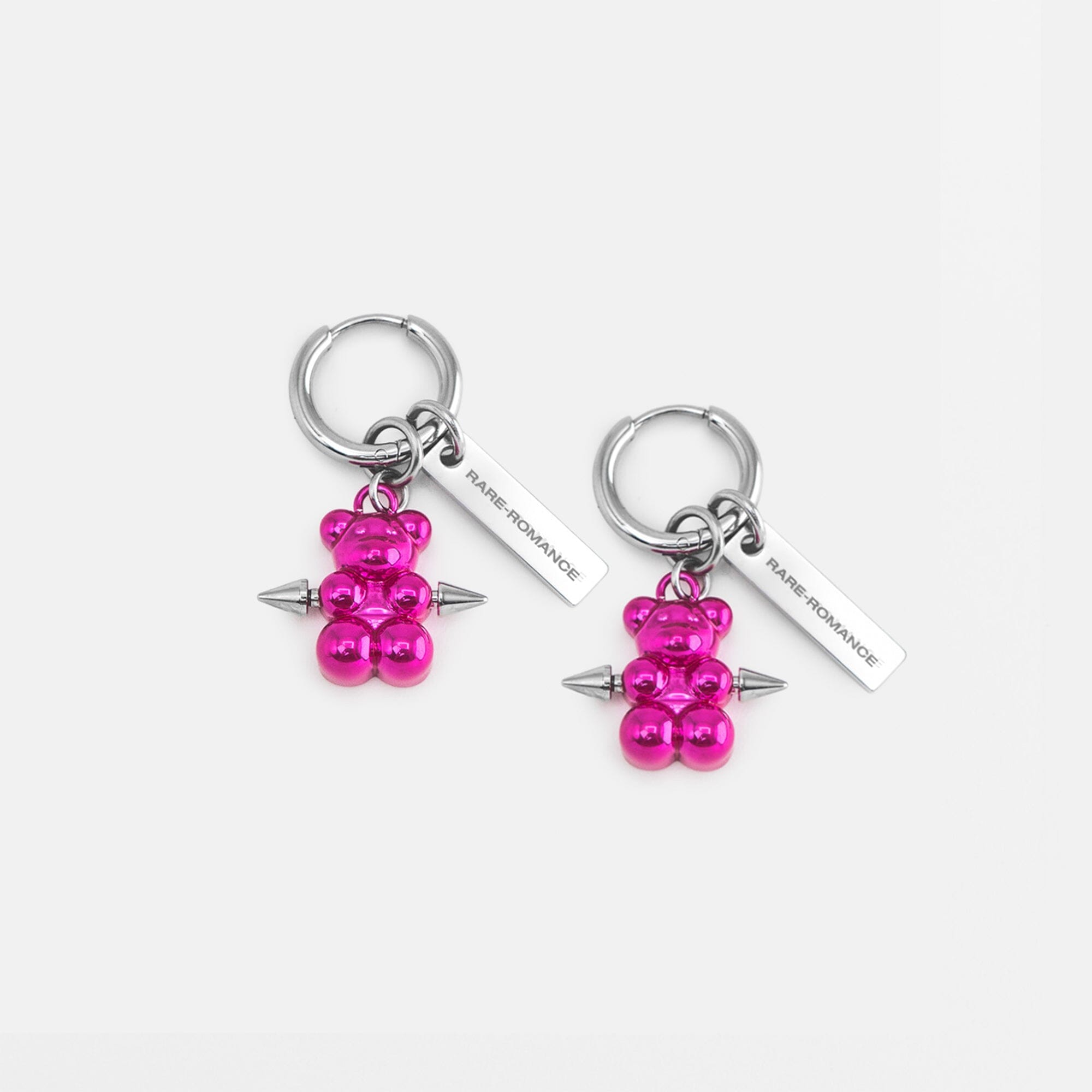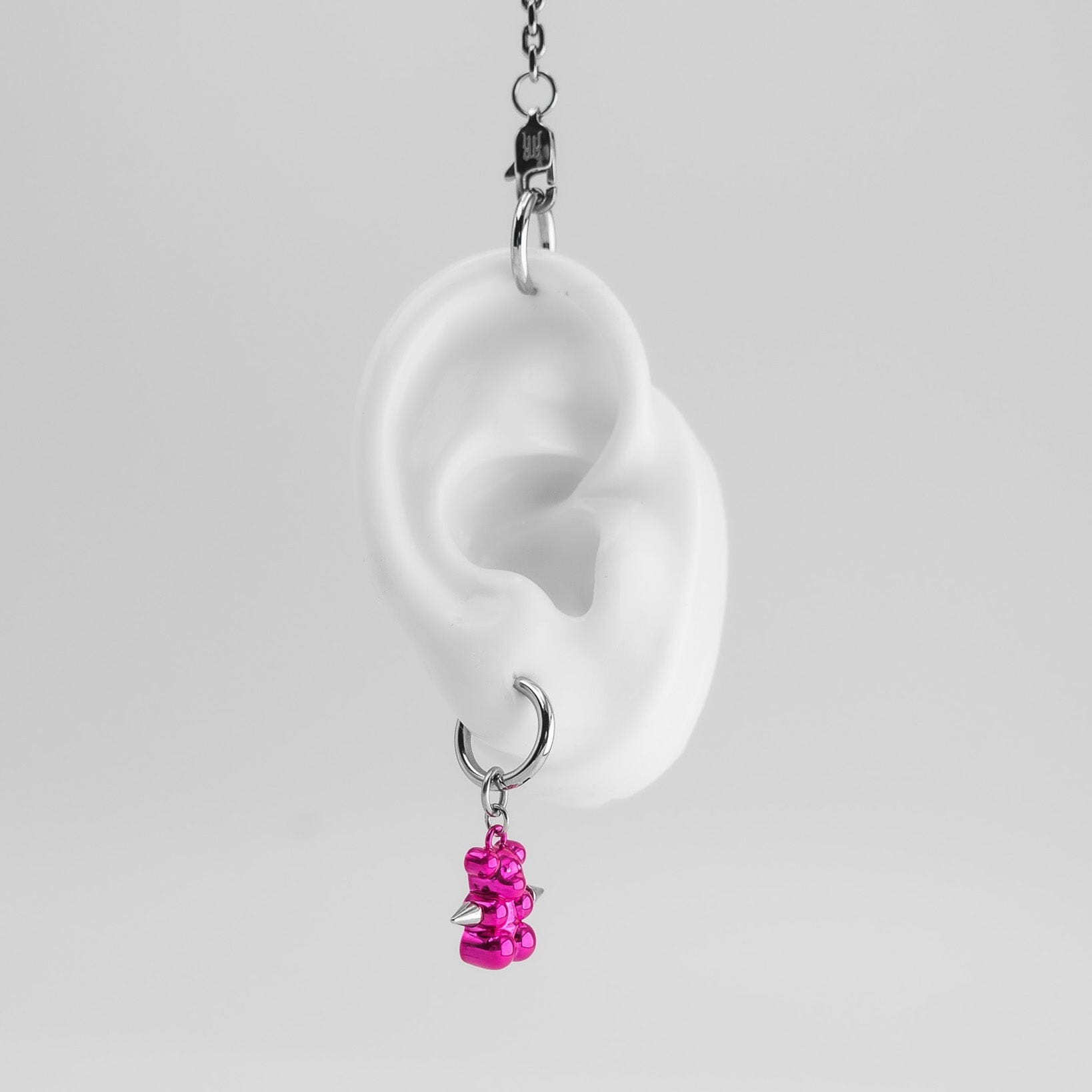 The sweetest sin you'll ever wear. A glossy metal gummy bear pierced through the heart, swinging from a clean hoop. Available in silver, pink, and gunmetal. Made from stainless steel built to last forever.