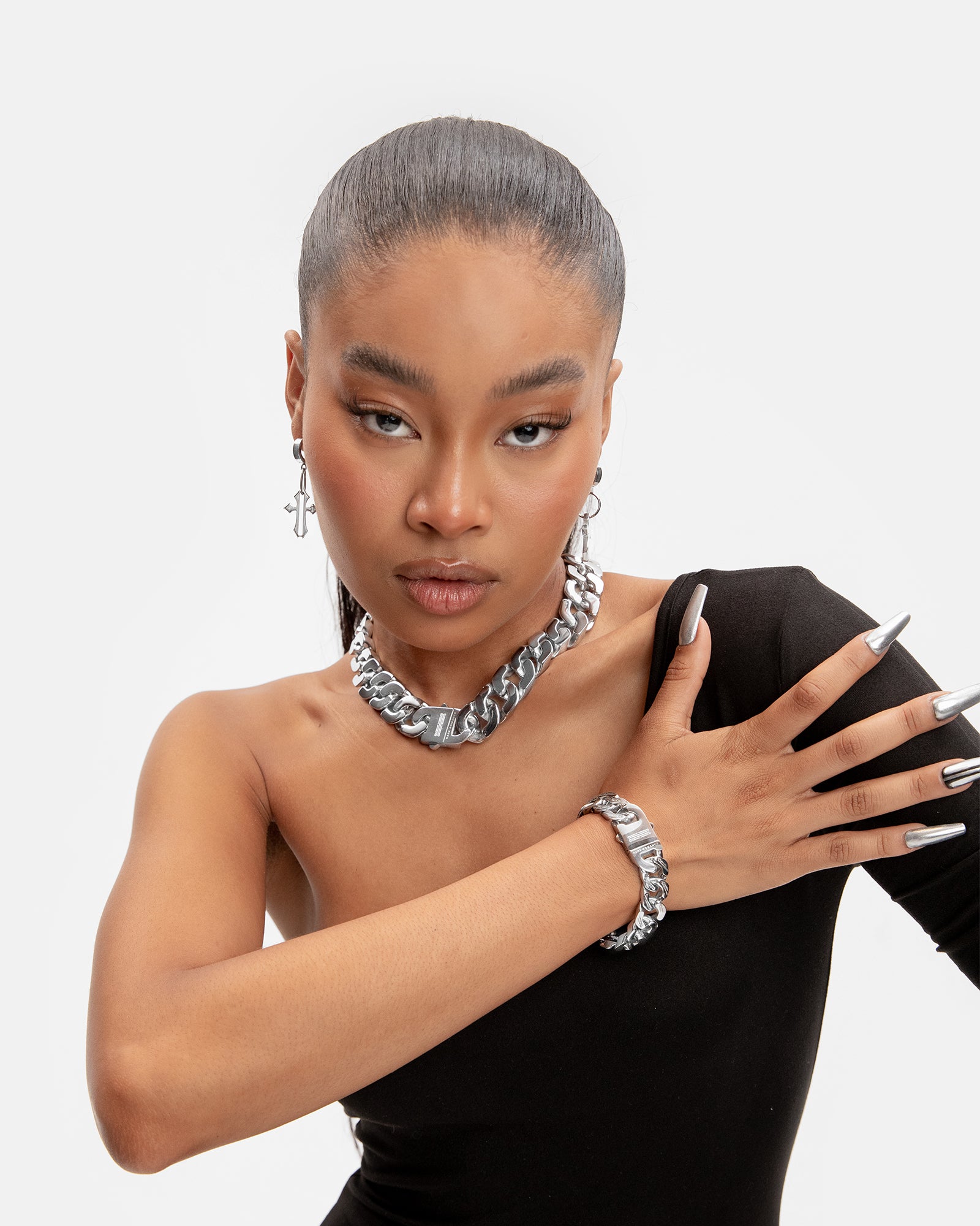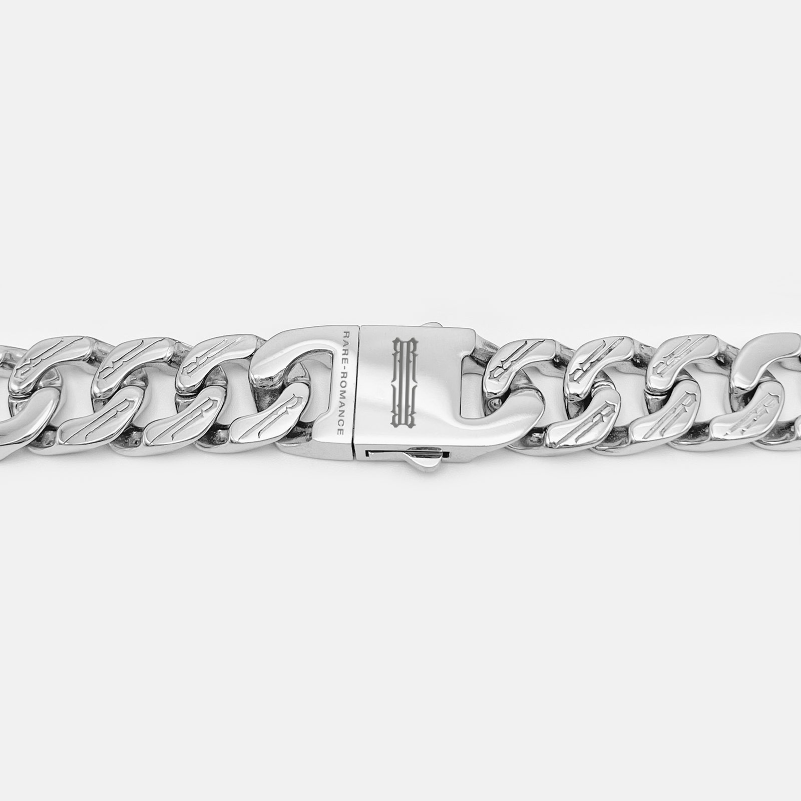 This exclusive industrial piece can add a statement to any fit. The bracelet combines interlocking links accented with deeply engraved ‘R’ monogram motifs. Made of hypoallergenic stainless steel, this bracelet has a strong buckle clasp that is laser-etched with the RR signature logo. Ships in RARE-ROMANCE™ branded packaging, perfect for gifts.
